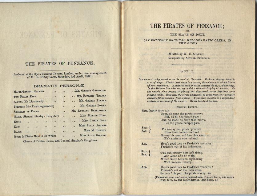 PL108. GILBERT, W. S. The Pirates of Penzance; or, The Slave of Duty London: Chappell & Co., [1880]; First edition; pp.32. Blue-grey wrappers. The "Dramatis Personae" on p.2 identifies the first printing of the libretto, which was not published until November 1880, some six months after the London premiere and nearly a year after the first performance! (For a more detailed history of the printing of the libretto, see Reginald Allen's First Night G&S). Light chipping to top and bottom of spine, wrappers detached. .....£60.00