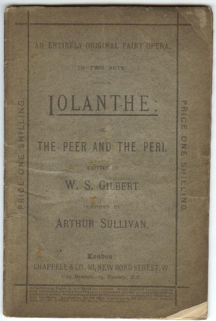 PL109. GILBERT, W. S. Iolanthe; or, The Peer and the Peri London: Chappell & Co., [1882]; Second edition; pp.39.1 advt. Blue-grey wrappers. Contains "Fold Your Flapping Wings." Has been folded vertically, back wrapper stained, front wrapper clipped to bottom right edge, some edge tears and the last two pages are missing their top right corner, no loss of text. .....£25.00
