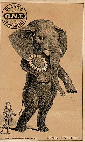 155. [After Patience] Jumbo Aesthetic Clarks O.N.T. Spool Cotton [1881]. Halftone image of Oscar Wilde-like figure next to Jumbo in aesthetic pose with a large sunflower reflecting the aesthetic craze created by DOyly Cartes management of Oscar Wildes American tour combined with the first US production of Patience. (3" x 4¾") .....£20.00